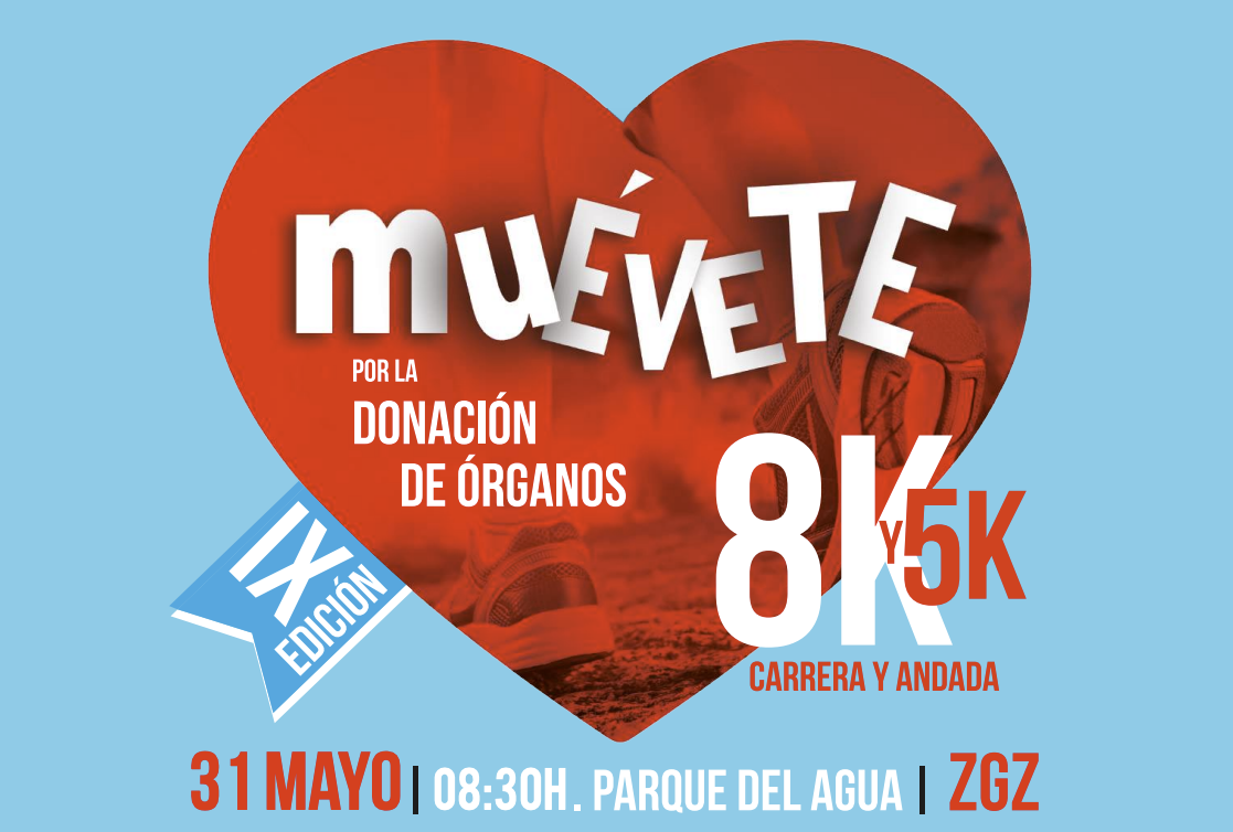 El domingo 31 de mayo de 2026 se celebrará en el Parque del Agua Luis Buñuel de Zaragoza la prueba IX Carrera y Andada "Muévete por la donación de órganos", que se realiza sobre una distancia de 5K y 8K.